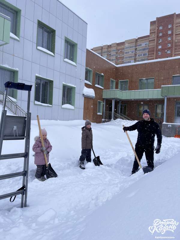 Этой зимой в Казани было очень очень много снега! В один из выходных мы всей семьей сходили в детский сад моей младшей сестры, чтобы почистить снег, чтобы маленьким детям было, где гулять и играть. Это было очень увлекательно и полезно, но и, конечно, мы немного устали!