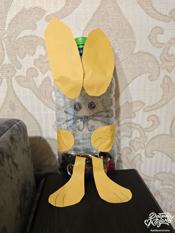 4 — из бутылочки для воды сделал хранилище для пуговиц в виде зайки