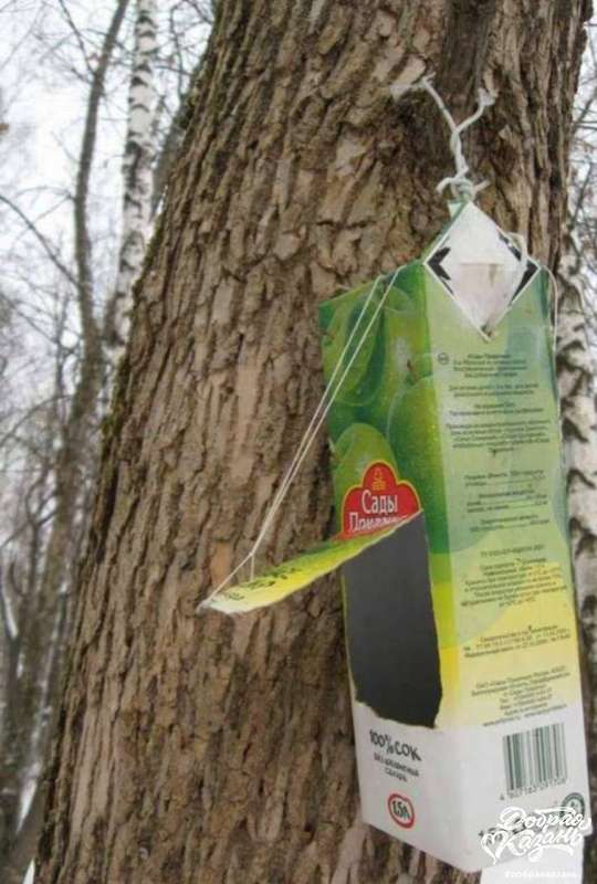 8 — из коробки из под сока сделали и повесили кормушку для птичек, туда насыпали семечек